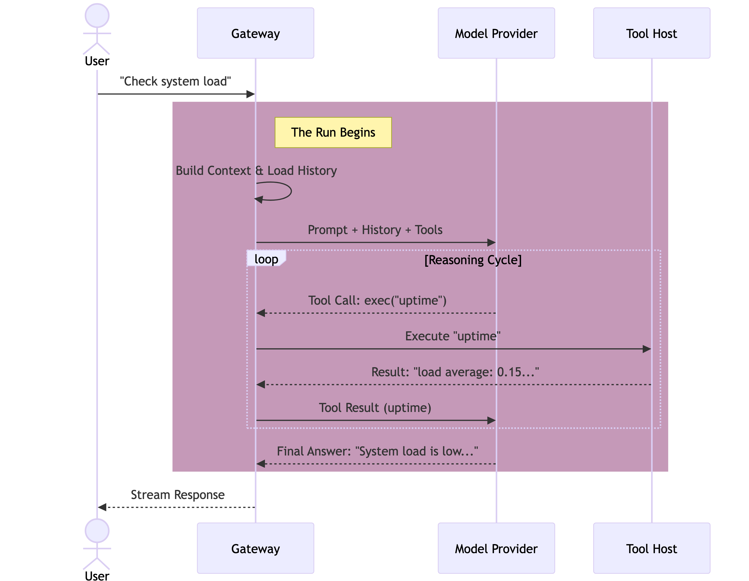read_file,exec), the Gateway pauses, executes the code securely on the host (or sandbox), and captures the output. - Recursion: The tool output is appended to the context, and control is handed back to the model. This cycle repeats.