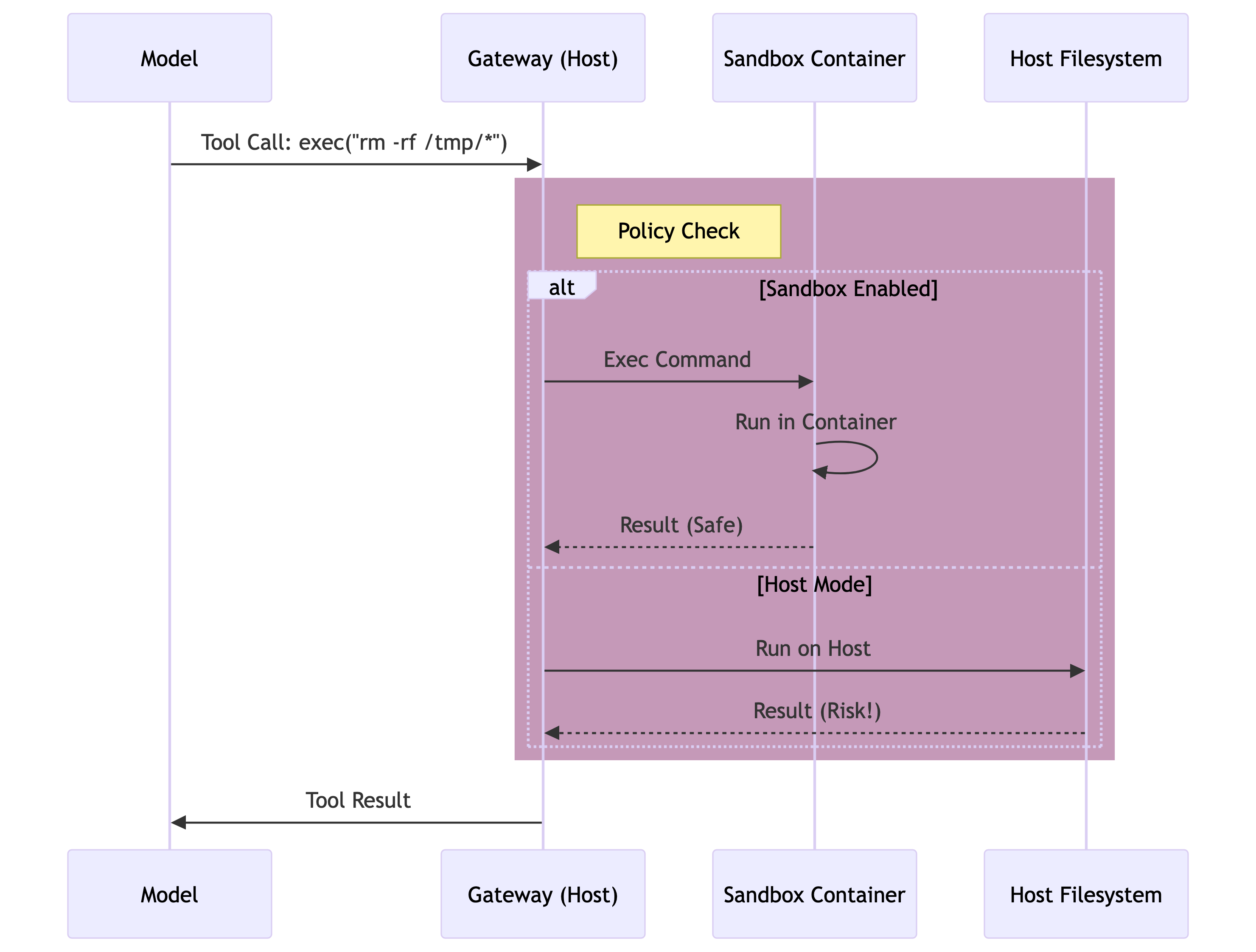 Allowing an LLM to run exec on your host machine is a high-trust operation. For tasks involving untrusted input (like summarizing a PDF from the internet) or risky operations (like refactoring a codebase), OpenClaw provides the Sandbox.