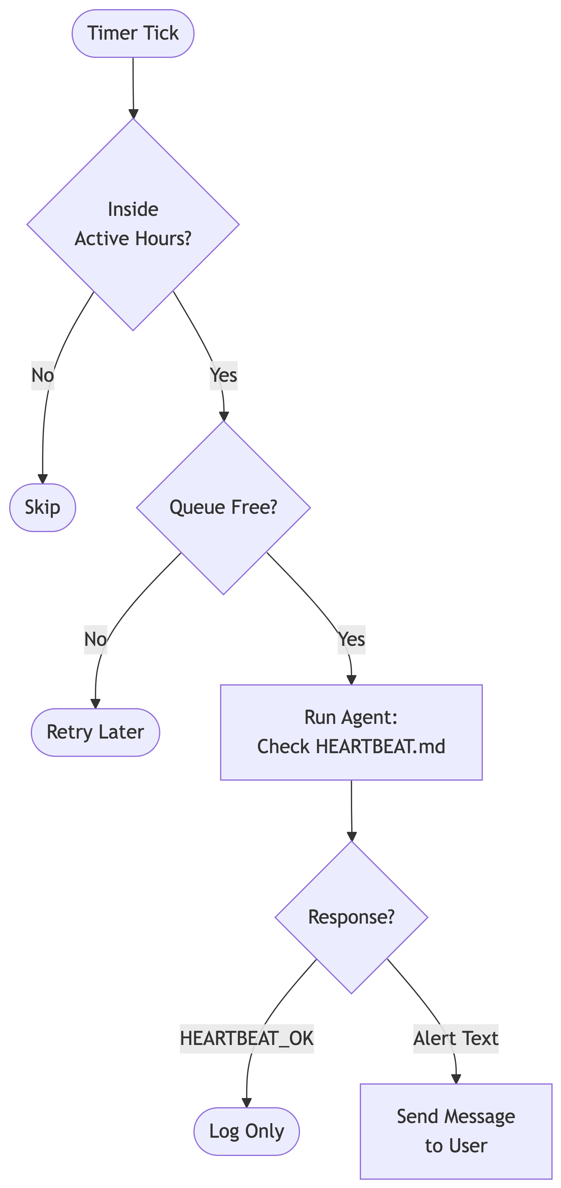 The Heartbeat is a rhythmic pulse, typically every 30 minutes. It triggers a run in the Main Session with a specific prompt: “Read HEARTBEAT.md. If nothing needs attention, reply HEARTBEAT_OK.”